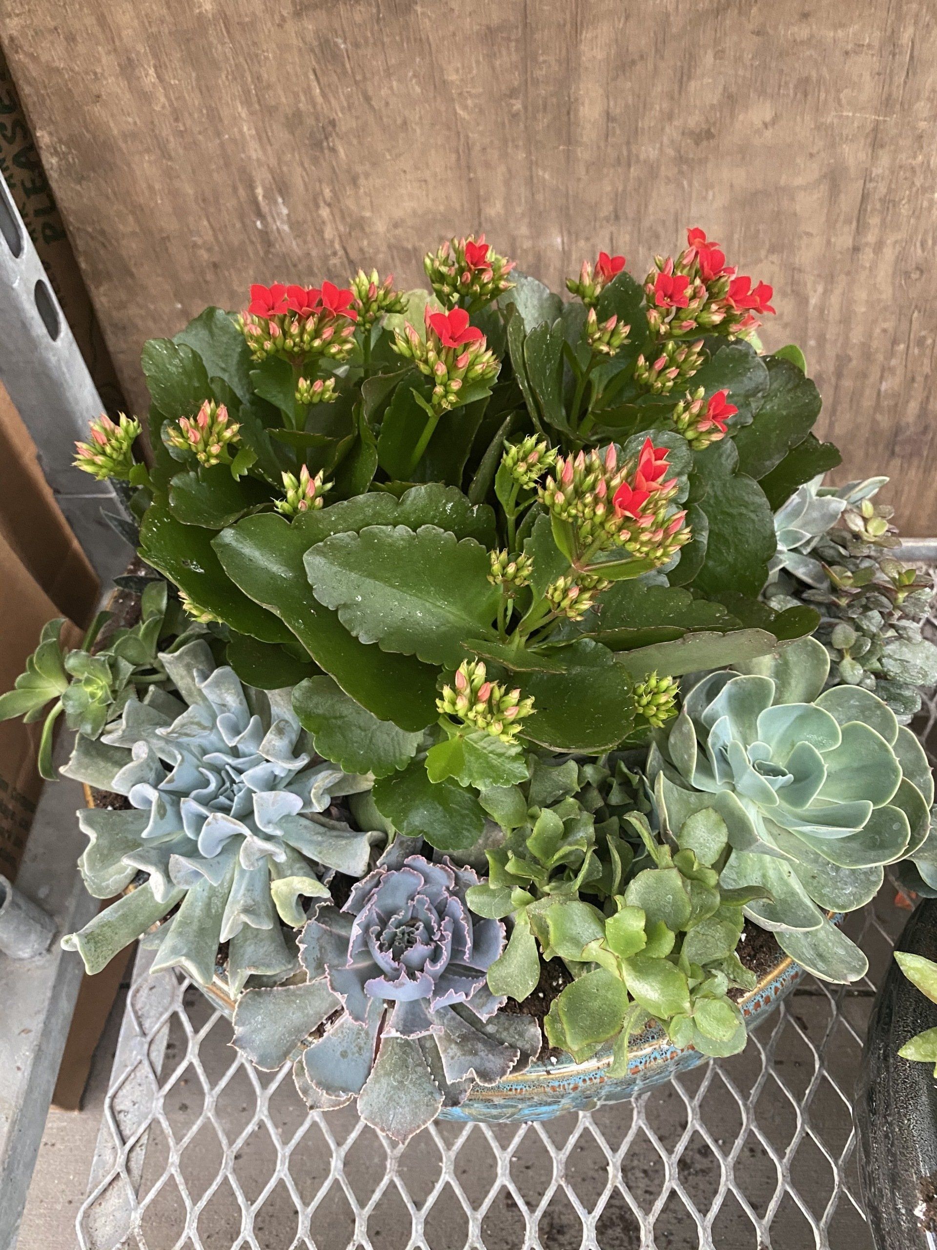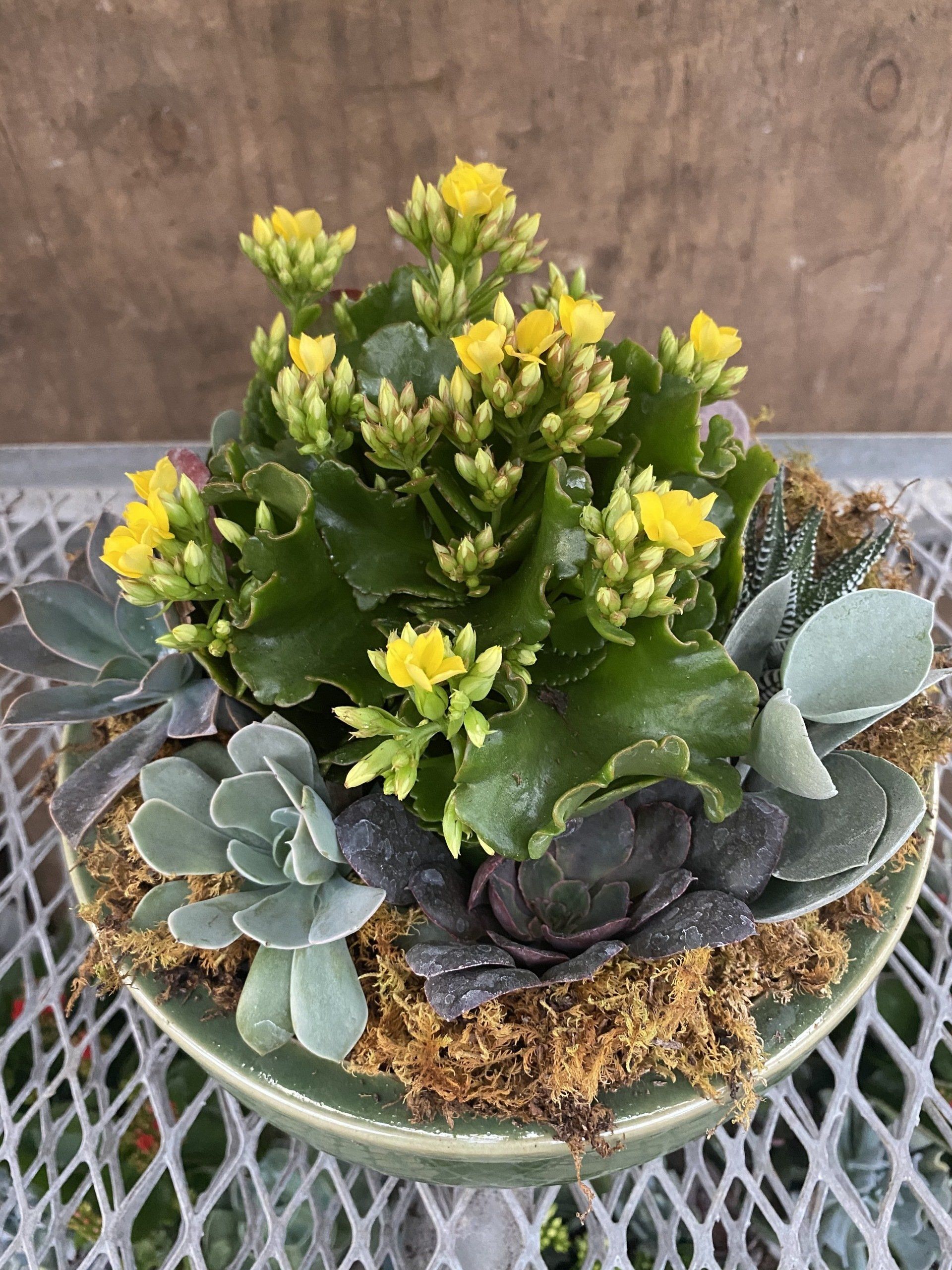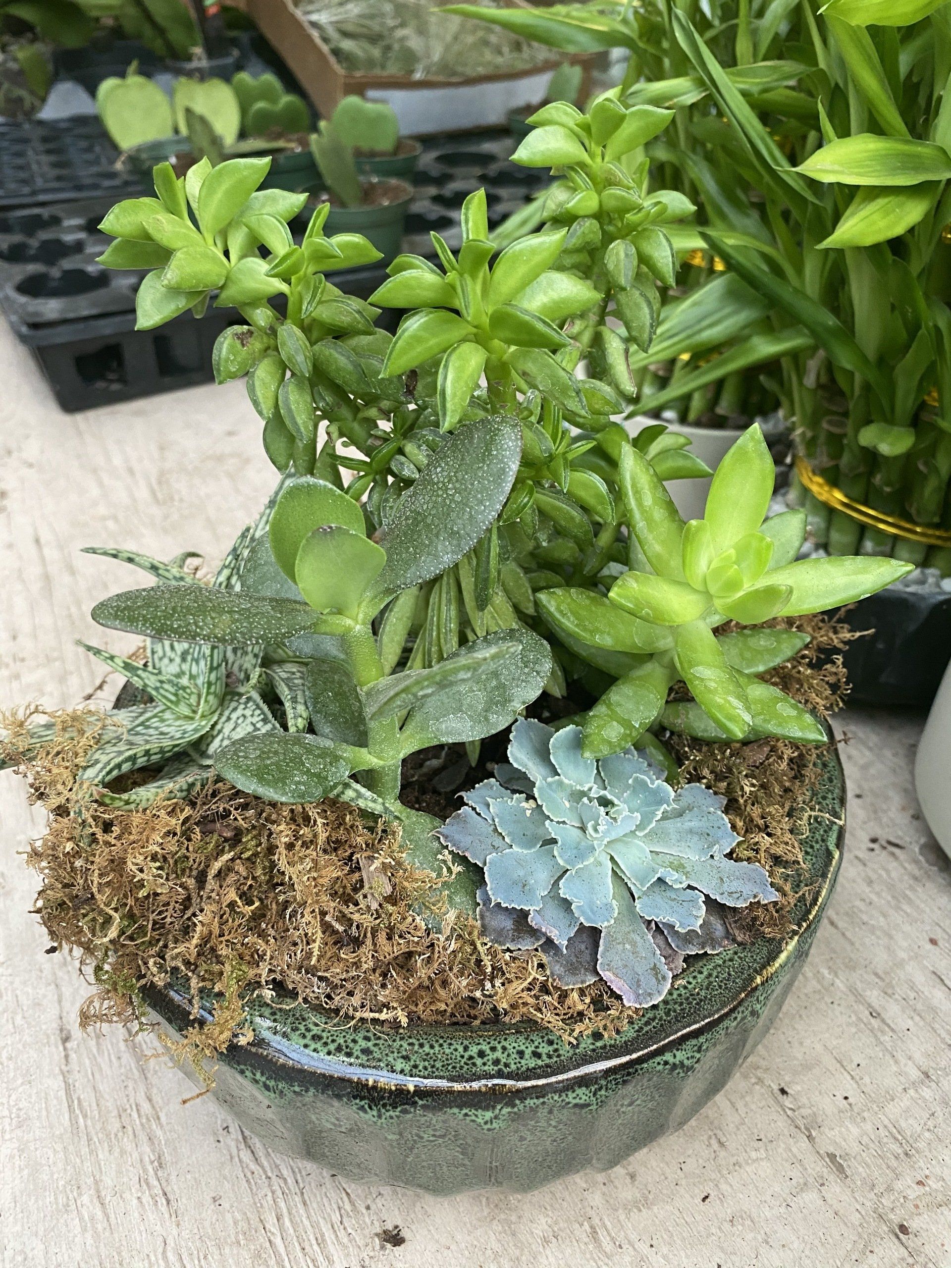 Mixture of Succulents in a ceramic container with sheet moss
